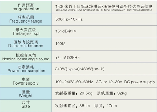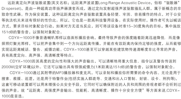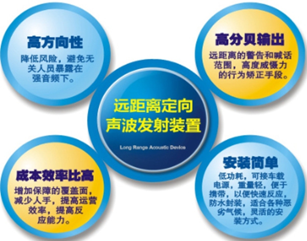 與傳統(tǒng)的擴音系統(tǒng)比較,遠距離定向聲波發(fā)射裝置是一種革命性的新技術。它具有非常的遠射功力,可以將聲音信息清晰地傳遞到數百米以外,甚至能穿越某些建筑物;它具有強大的震懾威力,可以逼迫受眾自動離開禁入區(qū)域;它具有精準的定向能力,可以瞄準一定角度發(fā)射難以承受的刺激性聲波,而在其它角度卻無不適。