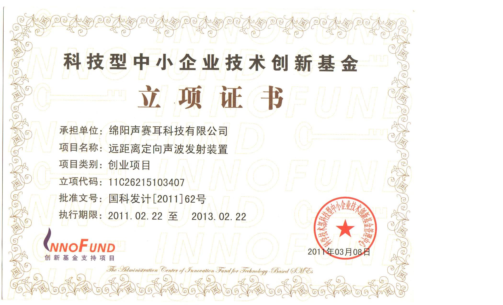 2011年9月16日,我公司正式取得中華人民共和國(guó)科學(xué)技術(shù)部中小企業(yè)技術(shù)創(chuàng)新基金管理中心簽發(fā)的“遠(yuǎn)距離定向聲波發(fā)射裝置”立項(xiàng)證書(shū),這標(biāo)志著我公司科技創(chuàng)新取得重大突破。